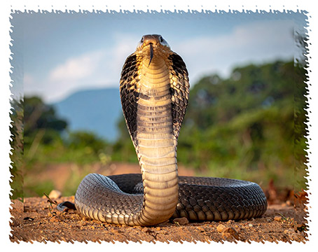 The Indian Cobra, Naja naja, is well known due to its impressive hood. Of the seven species of Cobra that dwell in Africa or Asia, none stages a more magnificent performance than the Indian Cobra. It accomplishes this by raising and pushing forward the long ribs behind its neck. It stretches its elastic skin taut over the framework, forming a flattened area that may be almost four times as wide as the diameter of its body! The hood of some Indian cobras is ornamented with two joined eyelike markings - the "spectacle." Others have a white circle bordered with black, to form a pattern resembling a target on the back side of the hood.