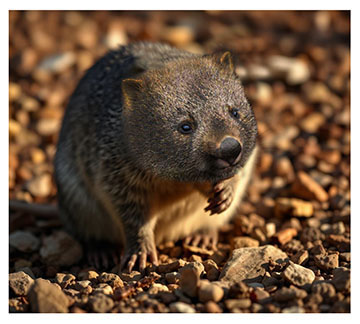 This little animal is about 4 feet long and weighs on average 80 pounds. It is a vegetarian and ambles about at night looking for grasses, roots and tree bark. Wombats make good pets and will eat all kinds of vegetables. Its voice is a harsh cough. The colors can be almost black to yellowish.